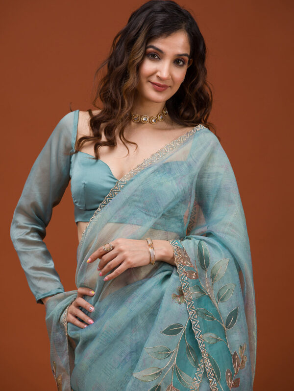 Turquoise Blue & Pink Floral Zari Silk Blend Banarasi Saree