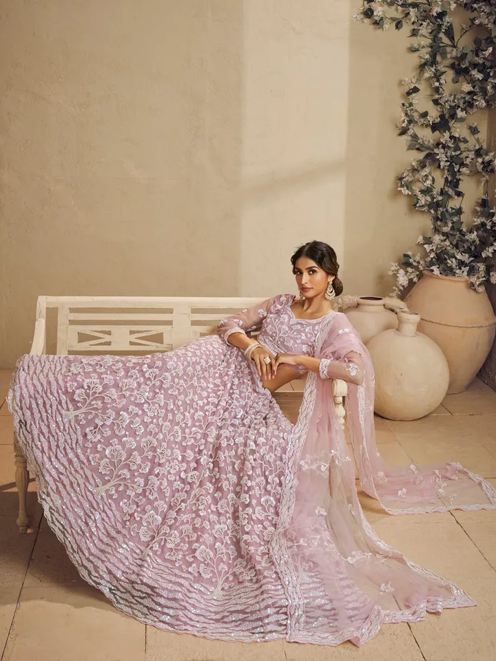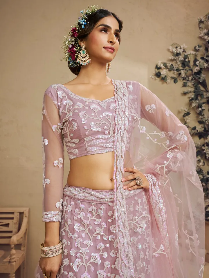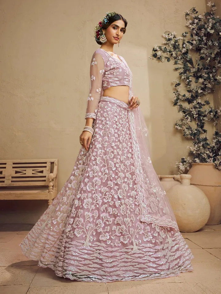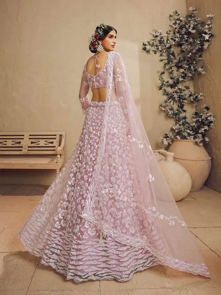 Pink and white embroidered lehenga choli with dupatta, has sequinns work