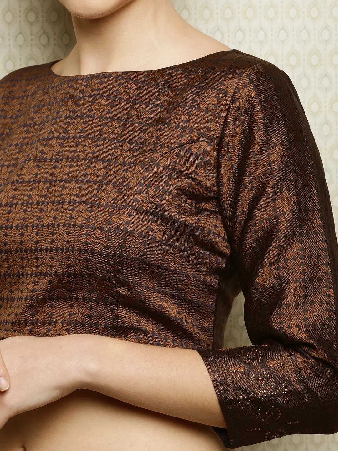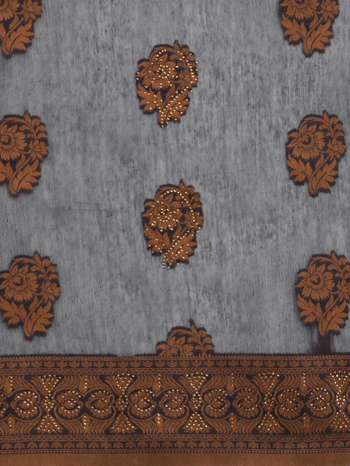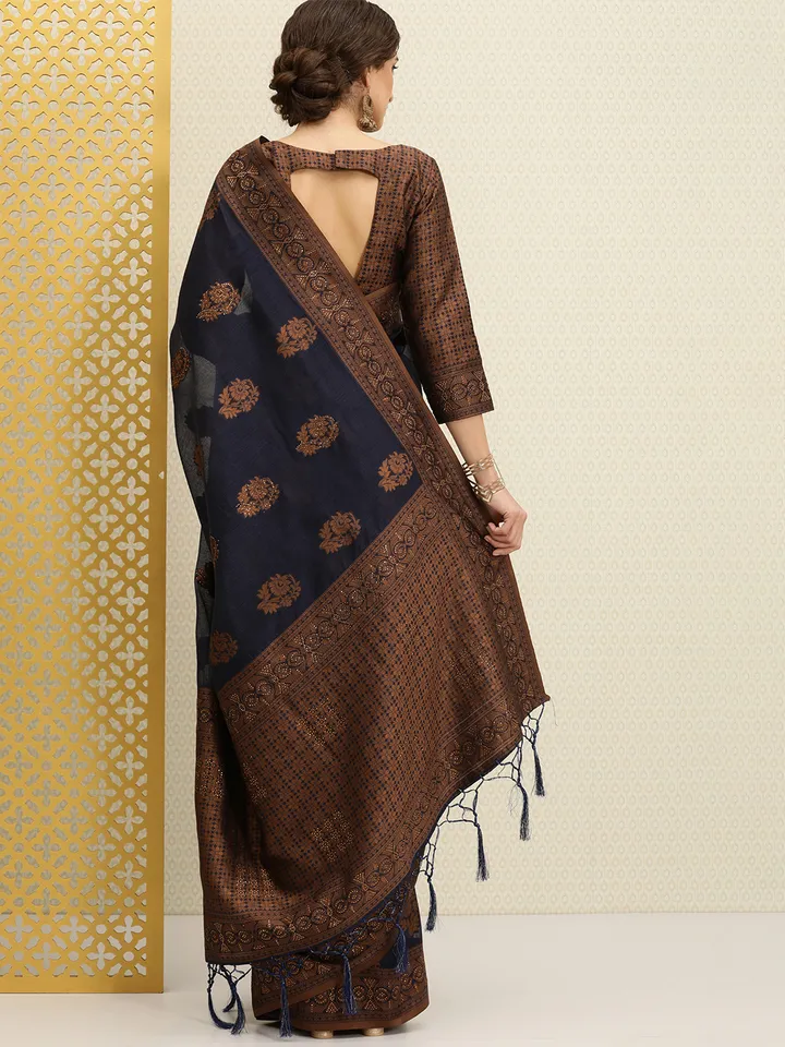 - Navy blue and bronze-toned saree
