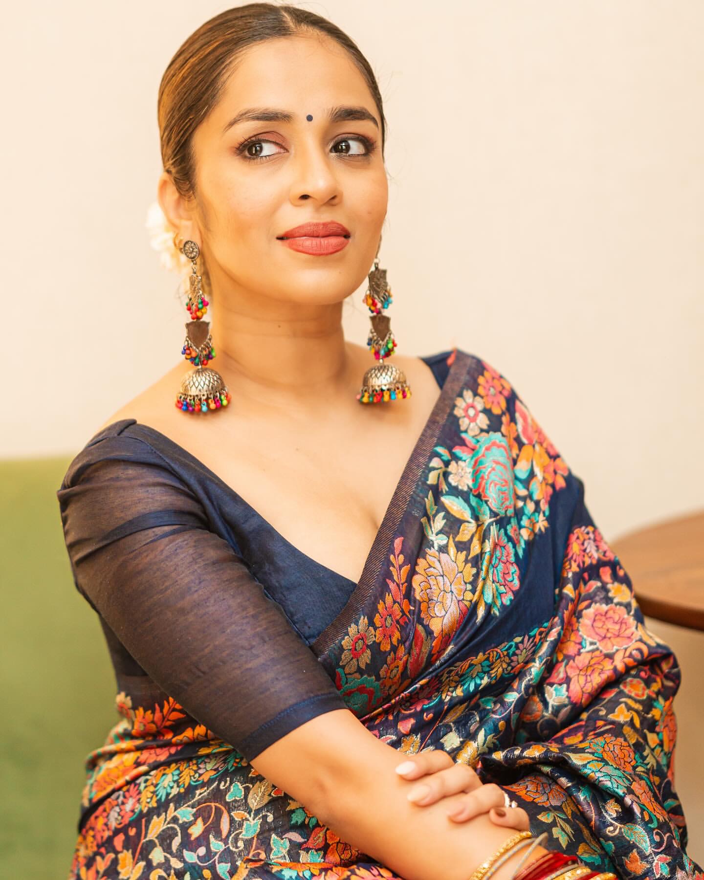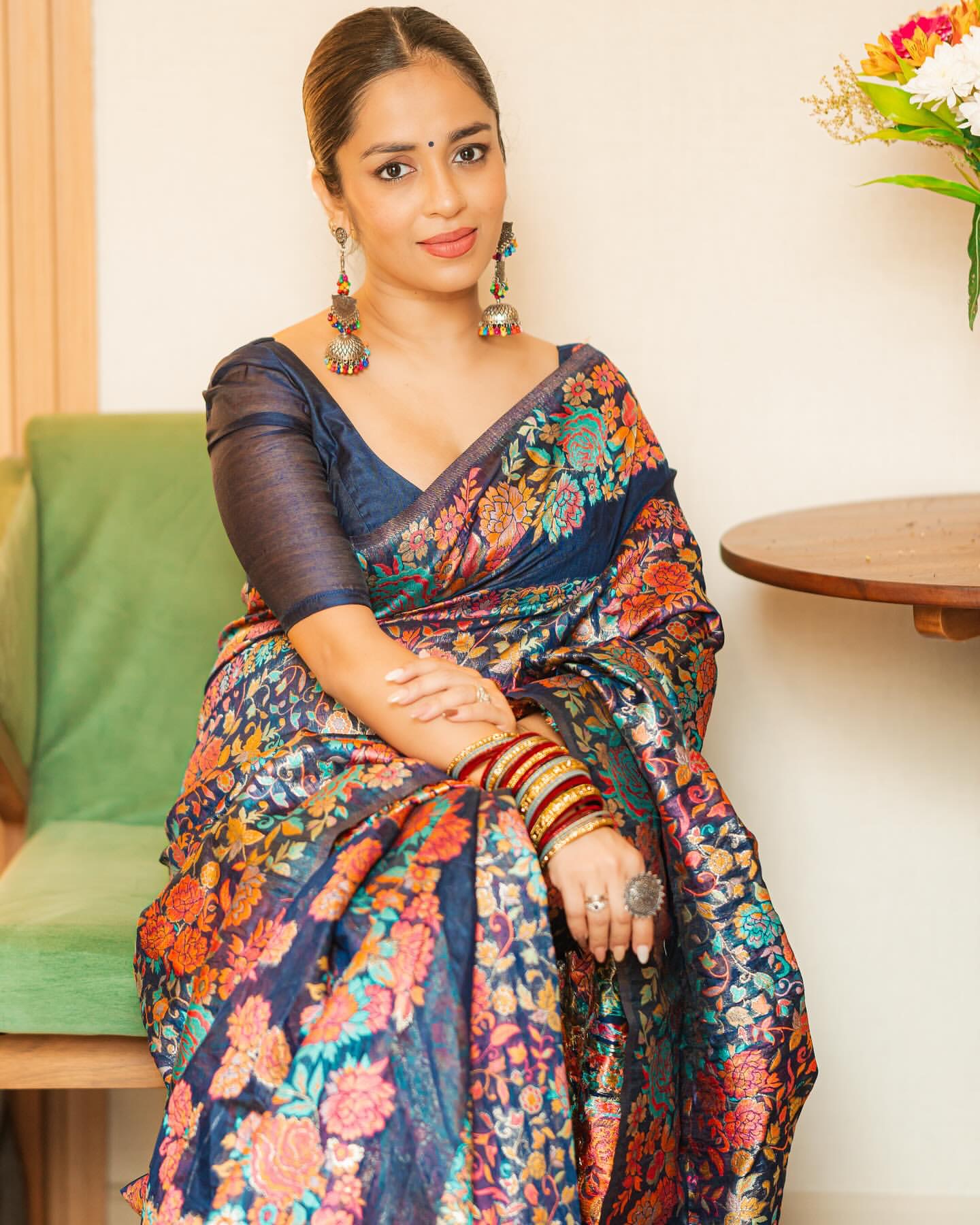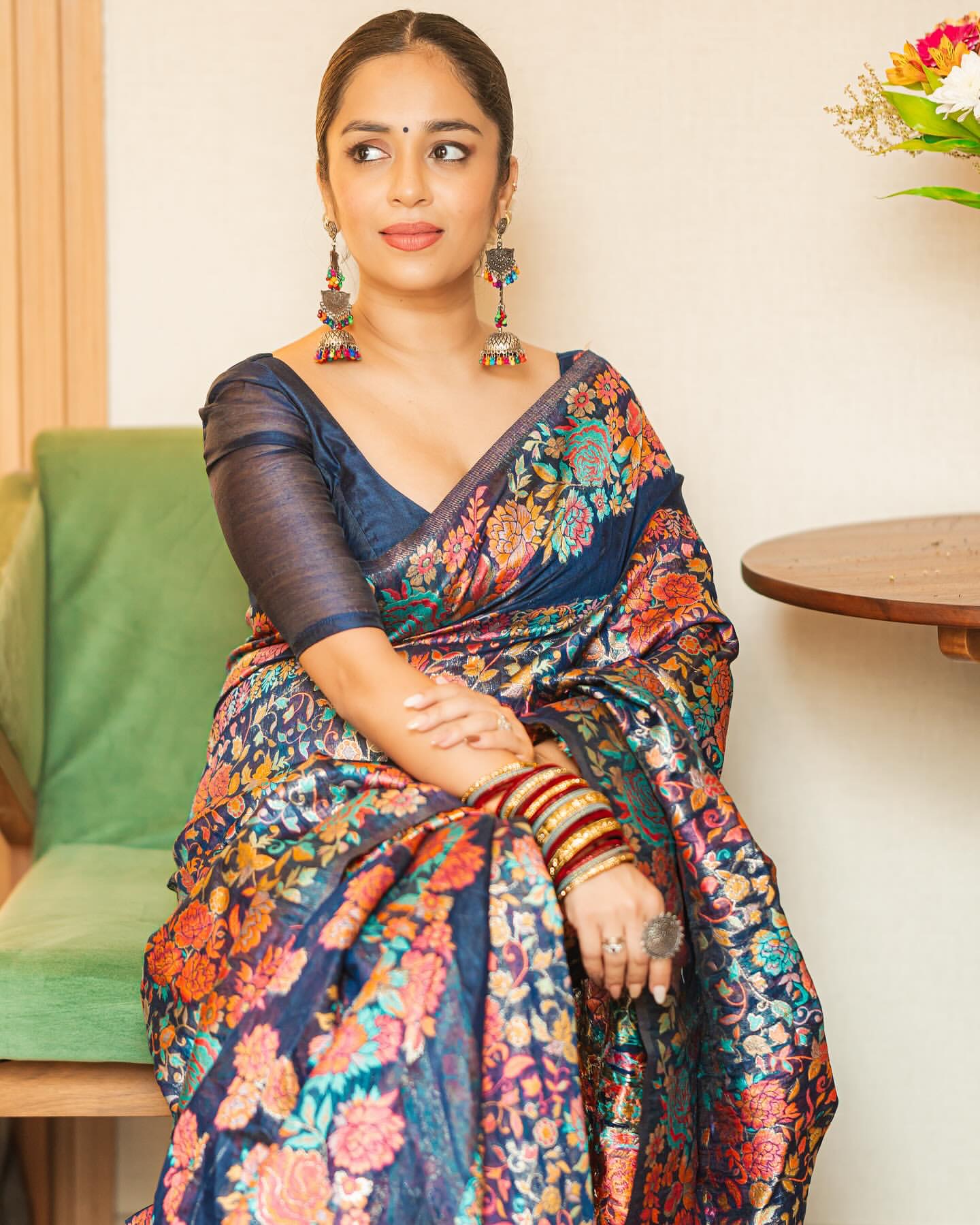 The blouse worn by the model might be for modelling purpose only. Check the image of the blouse piece to understand how the actual blouse piece looks like.