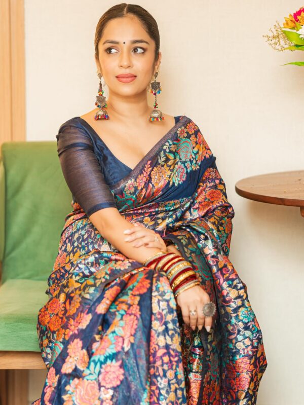 Navy Blue & Pink Floral Zari Silk Blend Banarasi Saree